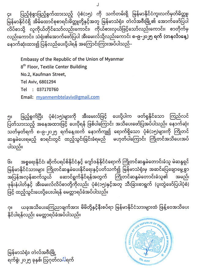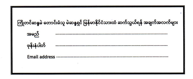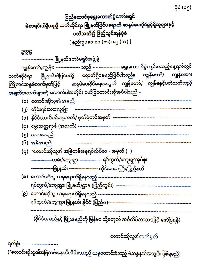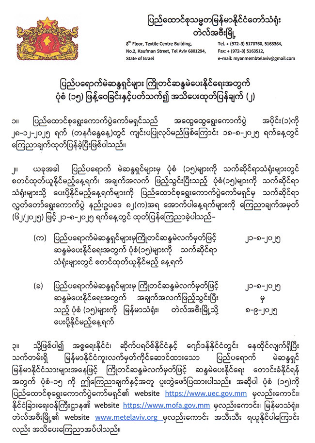ပြည်ပရောက်မဲဆန္ဒရှင်များ ကြိုတင်ဆန္ဒမဲလက်မှတ်ဖြင့် ဆန္ဒမဲပေးနိုင်ရေးအတွက် ပုံစံ (၁၅)ဖြန့်ဝေခြင်း