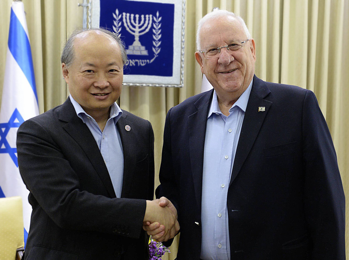Chinese Ambassador and the President of the State of Israel posing for documentary photograph.