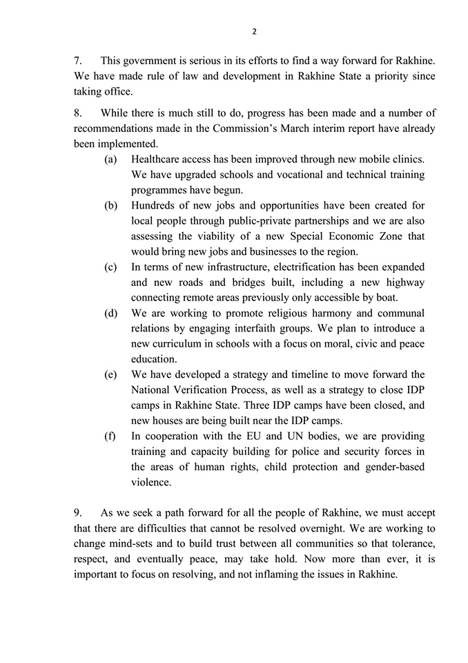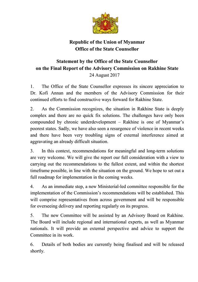 Statement by the Office of the State Counsellor on the Final Report of the Advisory Commission on Rakhine State (24 Aug 2017)